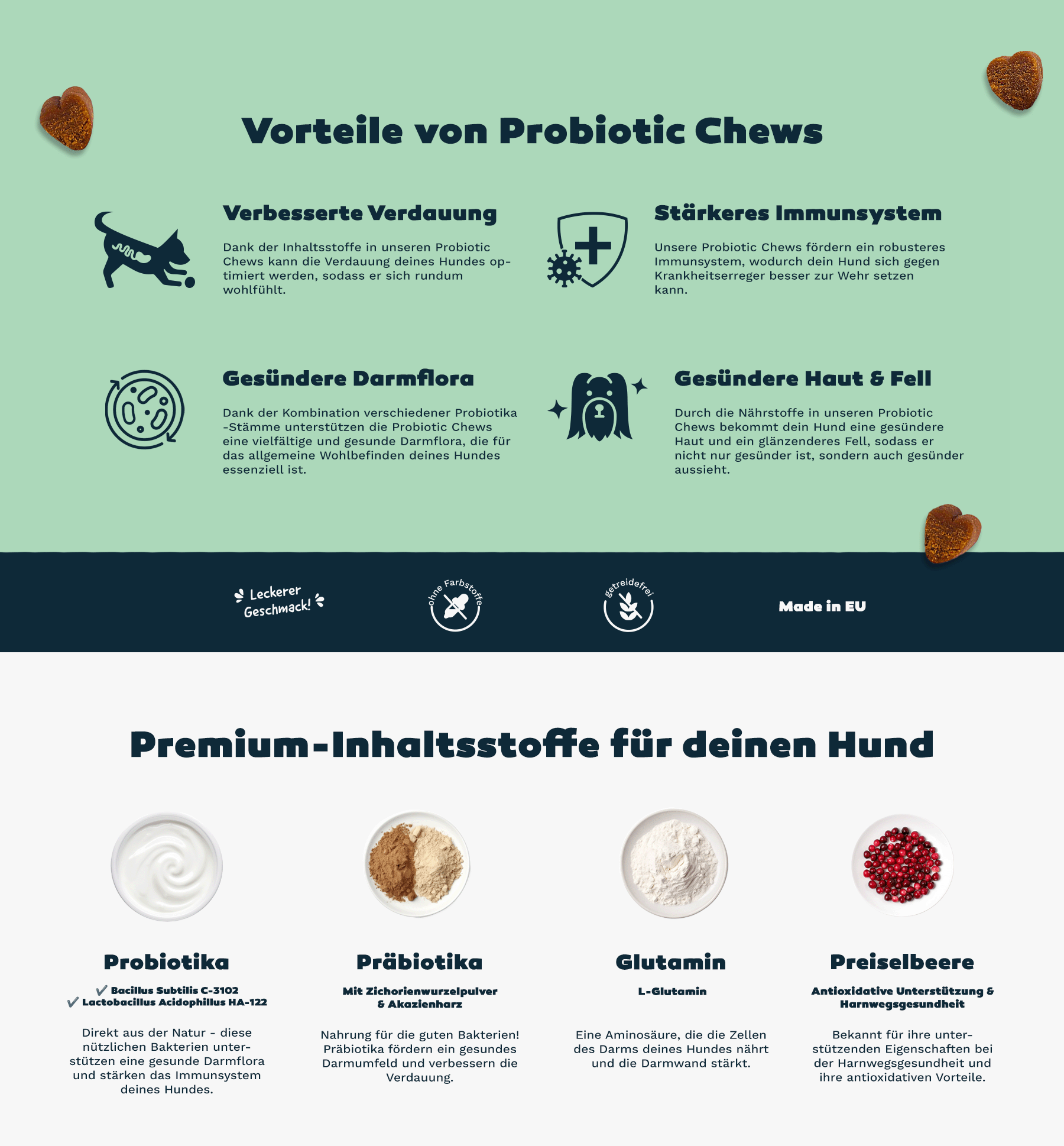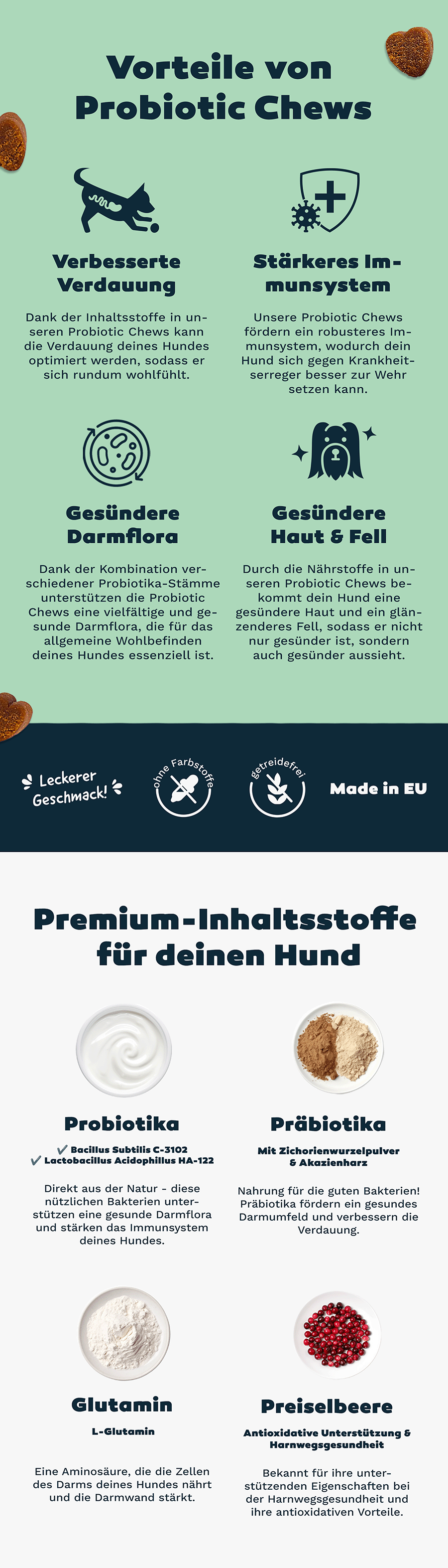 Mit Probiotic Chews bekommt dein Hund wertvolle Nährstoffe dank pre- und probiotischer Inhaltsstoffe sowie Zutaten wie Zichorienwurzel und Glutamin. Sie unterstützen die Darmgesundheit, lindern Magenprobleme und Durchfall, und stärken das Immunsystem. Ideal bei Anzeichen wie Grasfressen oder Kratzen.